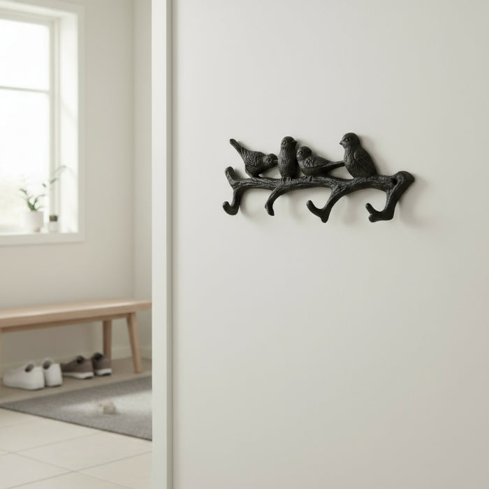 Valurautainen naulakko jossa lintuja koukkujen yllä.