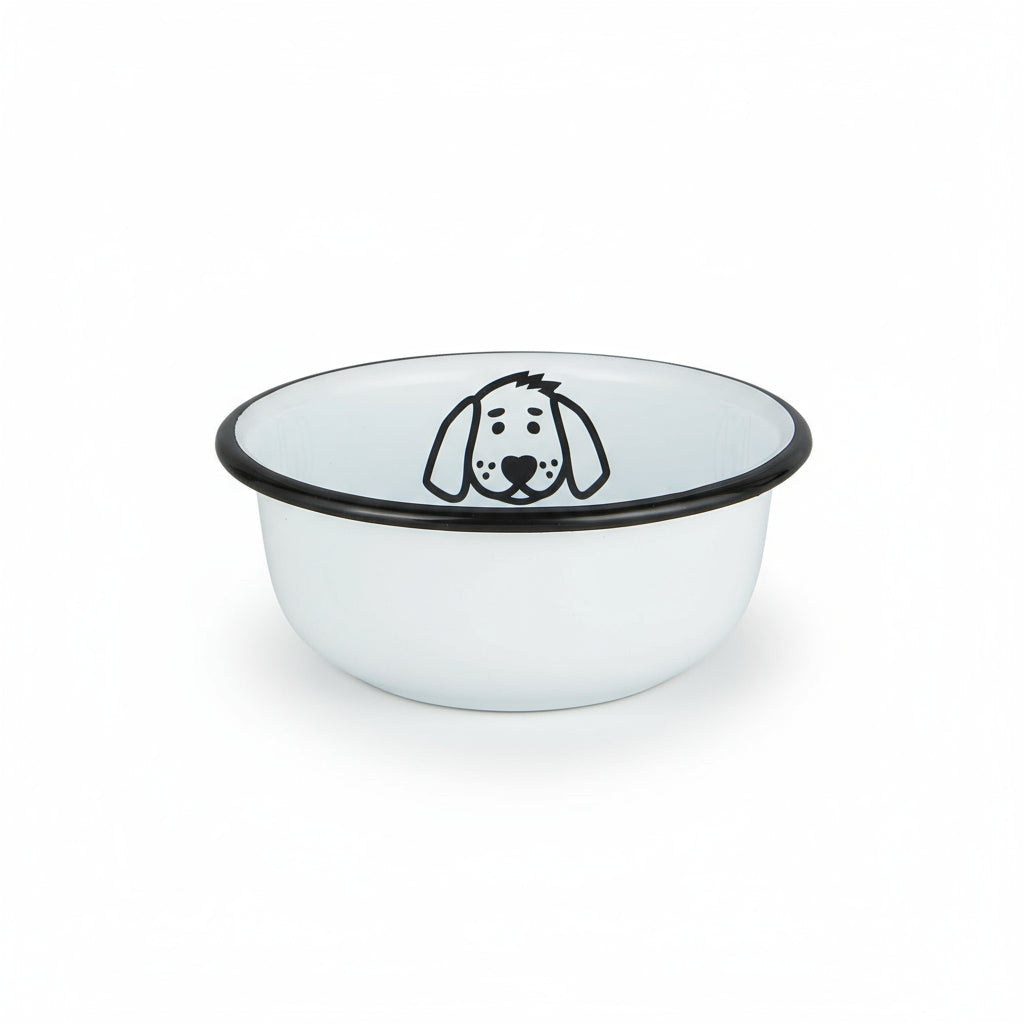 Kaunis ja kestävä emaloitu ruokakuppi, jossa on suloinen koirakuvio.