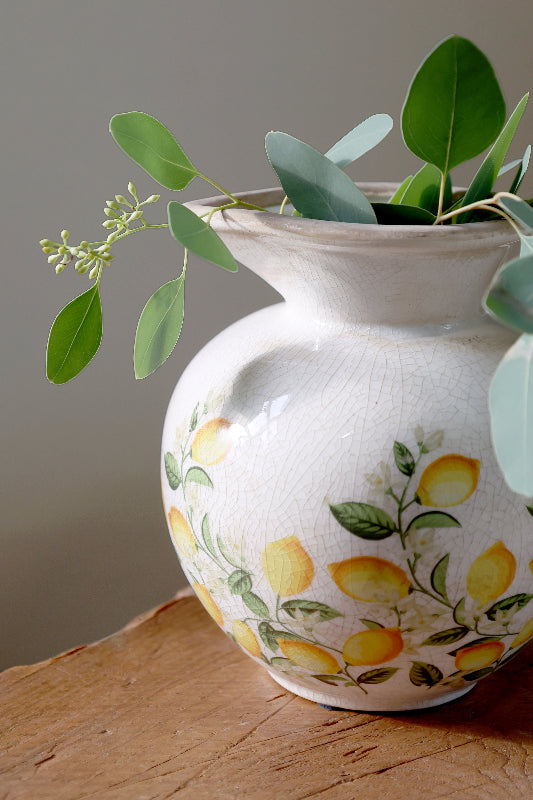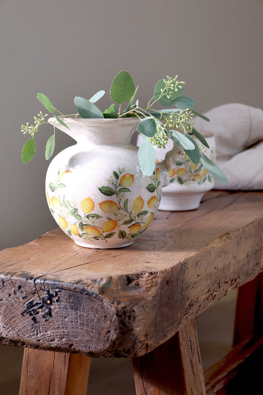 Kaunis keraaminen kannu hurmaa sitruunakuviollaan ja ajattomalla muodollaan. Kannu toimii upeasti niin kukkien ja oksien maljakkona kuin sisustuselementtinä sellaisenaan. Raikas kuosi tuo välimerellistä tunnelmaa kotiin, terassille tai parvekkeelle.