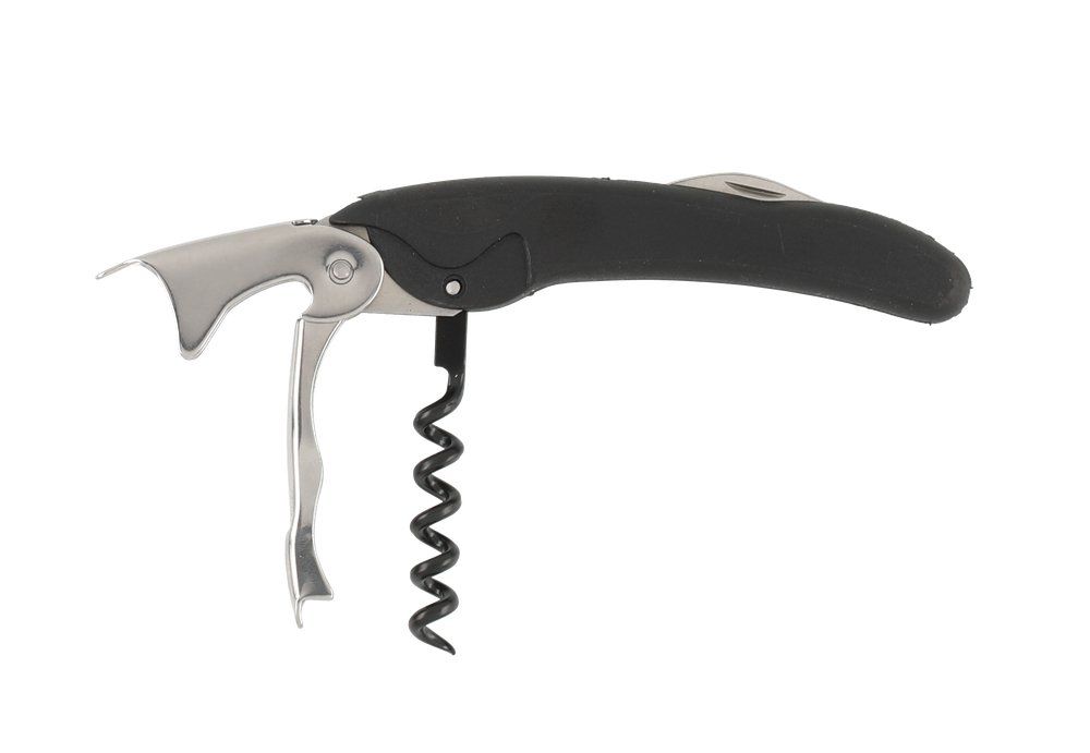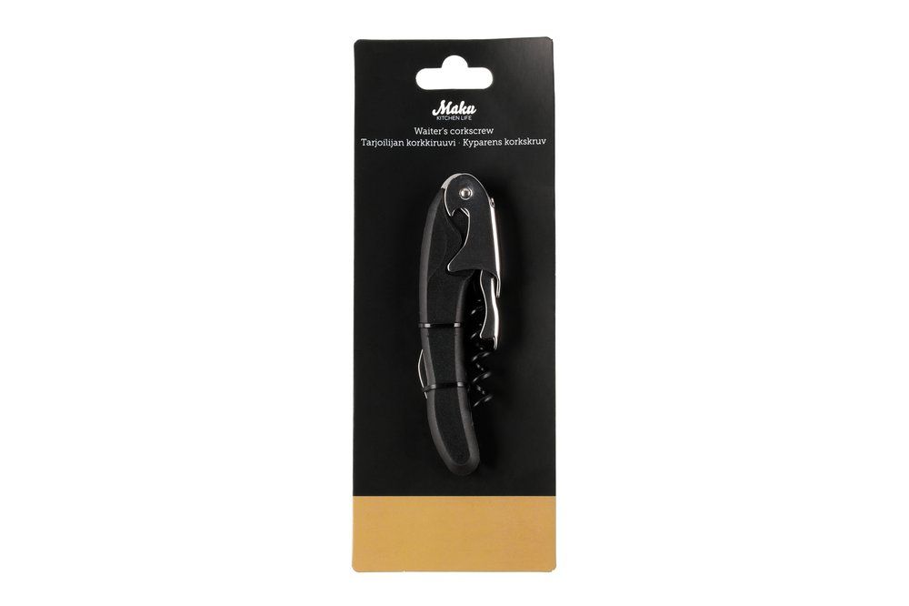 Tarjoilijan korkkiruuvissa on korkkiruuvin lisäksi sahateräinen kapselileikkuri sekä kruunukorkin avaaja.
