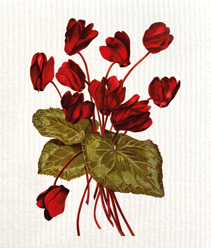 Kaunis syklaamikuvioinen tiskiliina tuo keittiöön tyylikästä väriä ja ajatonta kukkaloistoa.