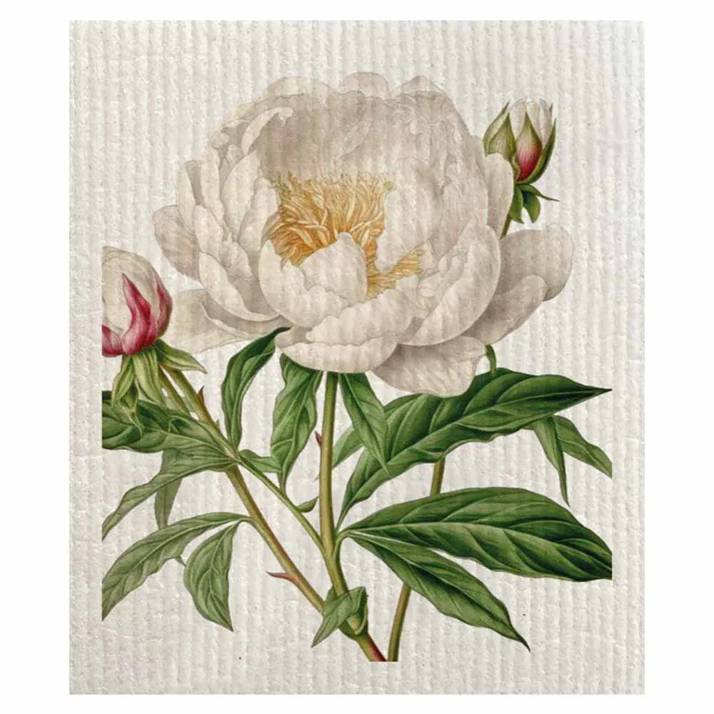 Kauniilla pionilla koristeltu tiskirätti tuo keittiöön iloa ja väriä!