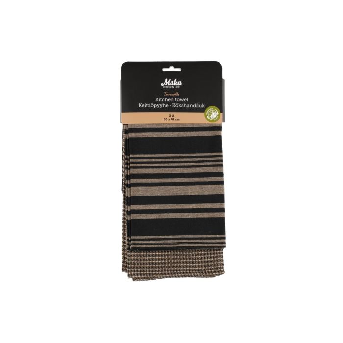 Tyylikäs keittiöpyyhesetti kierrätysmateriaalista. Setti sisältää kaksi pyyhettä, joista toinen raidallinen ja toinen yksivärinen.