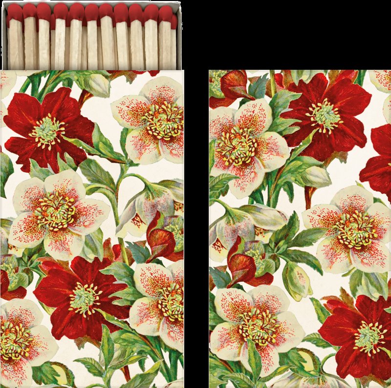 Kauniit jouluruusukuvioiset tulitikut tuovat juhlan tuntua kotiin! Pakkauksen vanhanaikainen kukkakuosi tekee näistä sekä käytännöllisen että kauniin sisustuselementin – täydelliset joulun kynttilöiden ja takkatulen sytyttämiseen.