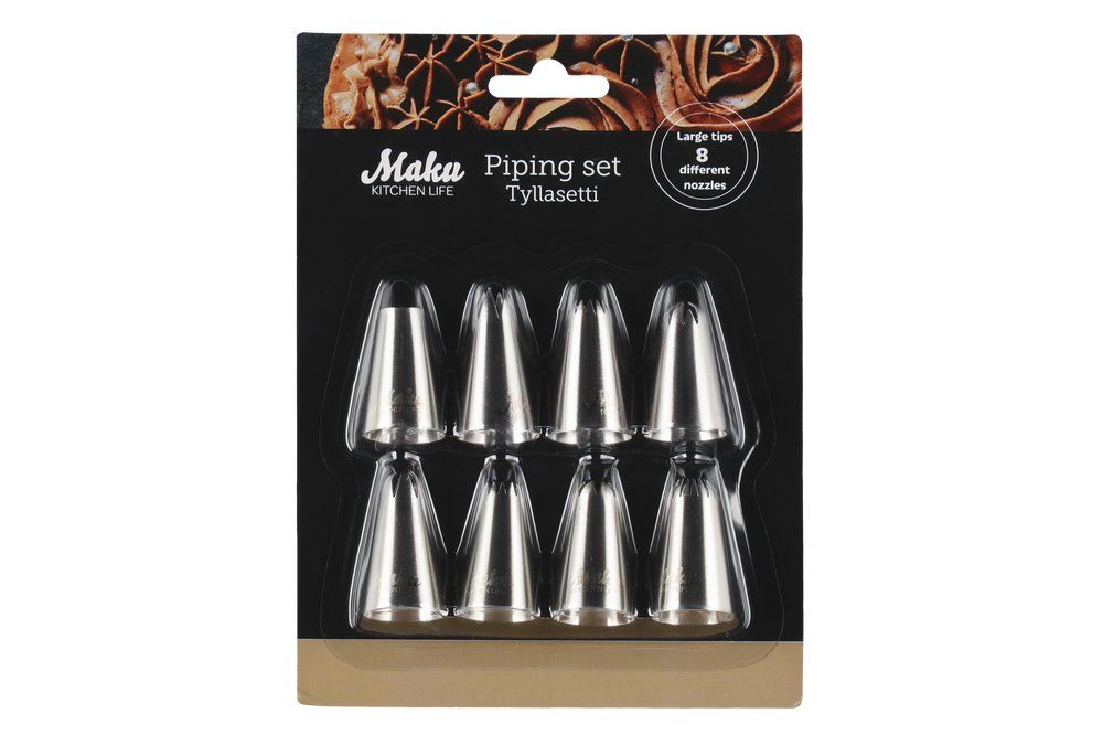 Hauskat koristelut tekevät leivonnaisista entistä herkullisemman näköisiä. Pursotinsetti koristeluun, leivontaan ja annosteluun. Pursotinsetissä on kahdeksan erilaista pursotinterää, joilla on helppo tehdä kauniita koristeluja. Leveys 2,5 cm, korkeudet 3,7 cm - 4,4 cm. Pursotinpussit myydään erikseen. Konepesun kestävä.