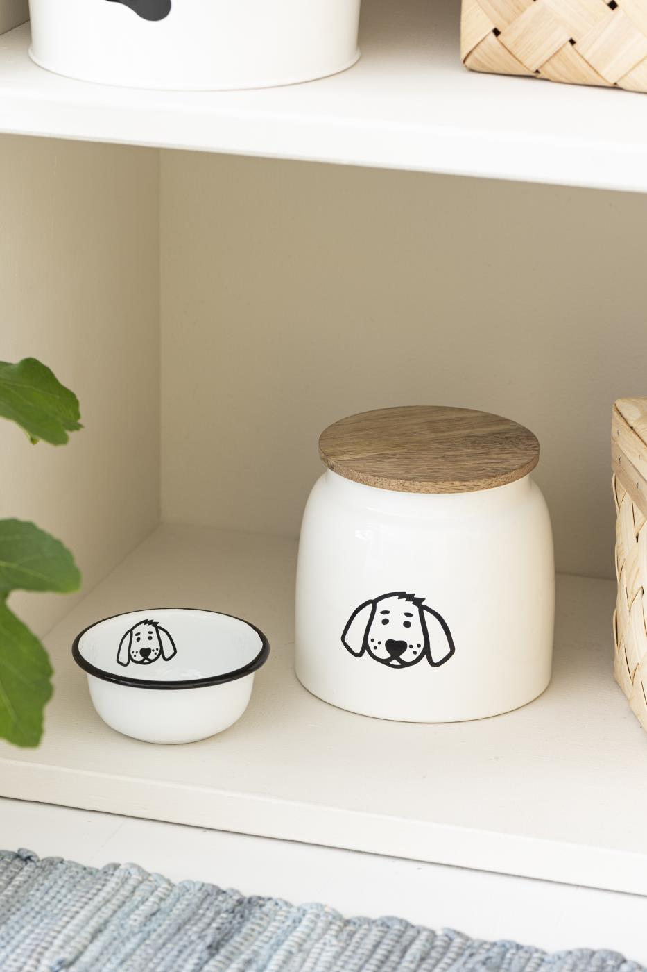 Tyylikäs ja käytännöllinen emaloitu säilytyspurkkI koiranruualle, jossa on kaunis koirakuvio ja luonnollinen puinen kansi.