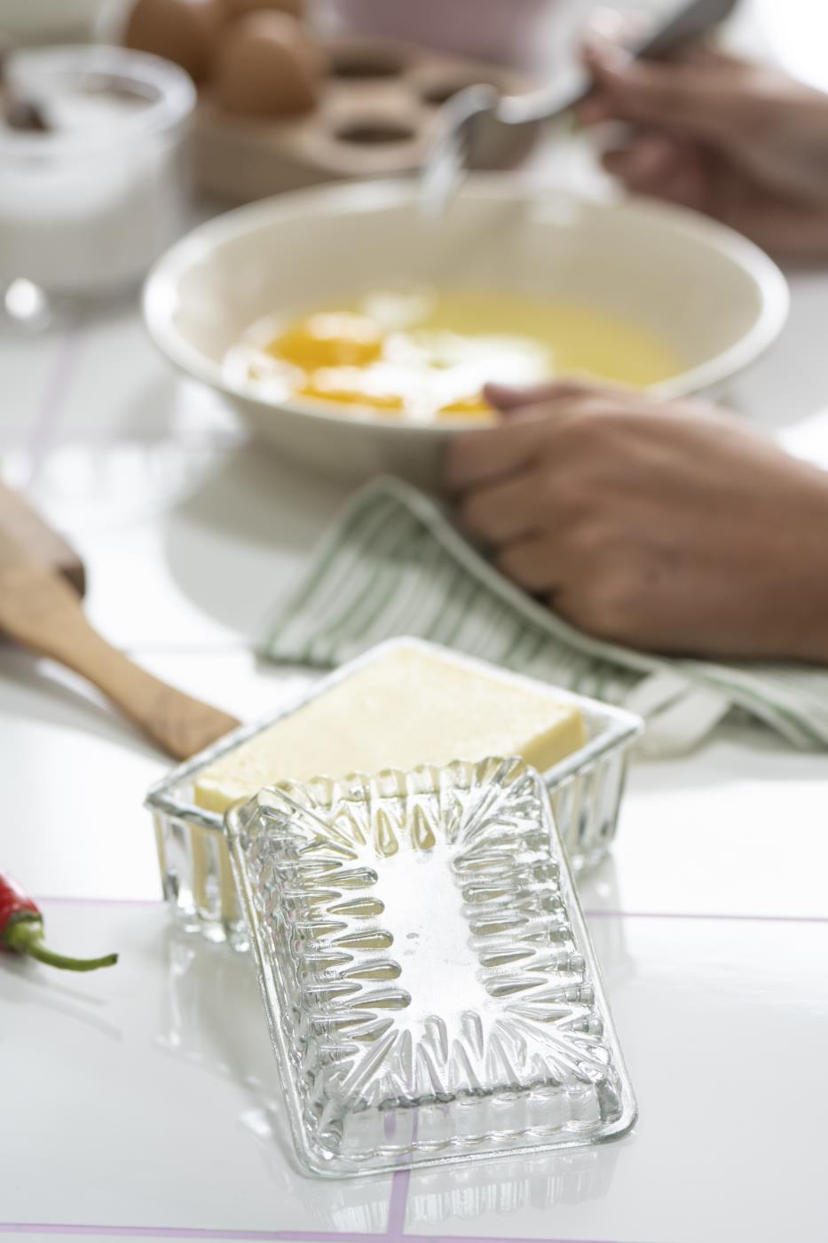 Kirkas lasi tuo esille voin kauniisti ja pitää sen suojassa jääkaapin hajuilta. Rasia pitää voin myös lämpimällä pidempään hyvänä ruokapöydässä.