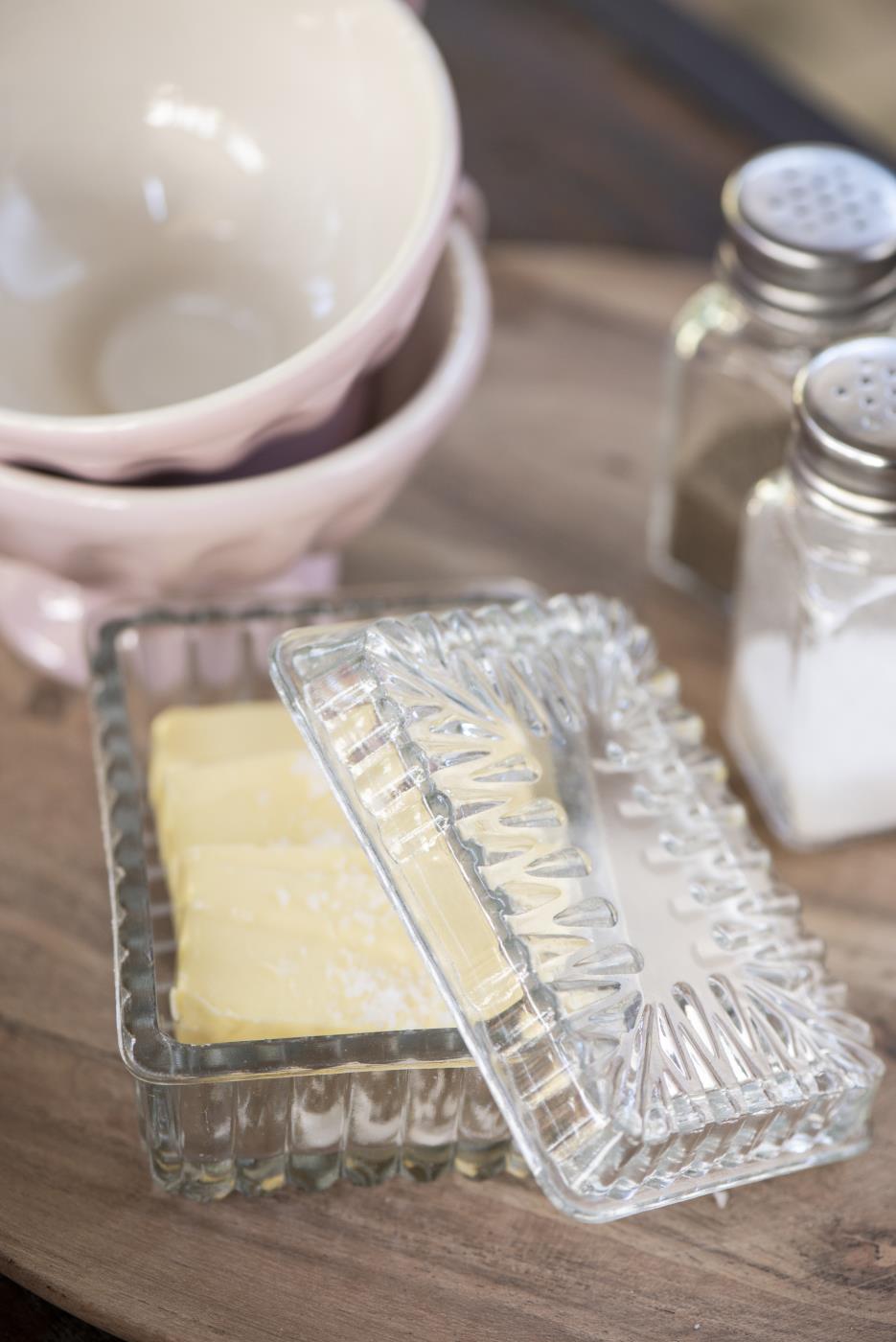 Tyylikäs ja ajaton lasinen voiastia, joka sopii täydellisesti arkeen ja juhlapöytään.